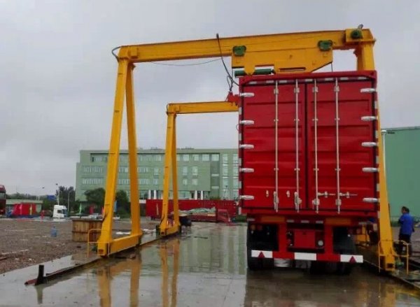雙懸臂軌道式集裝箱龍門吊由于集裝箱需通過兩側(cè)門腿內(nèi)空間。所以門腿內(nèi)的寬度方向凈空較大。依門腿承載主梁的形式不同,雙懸臂軌道式集裝箱門式起重機(jī)一般采用門腿上部敞開成“U”形和門腿上部連通成“Π”形。無懸臂軌道式集裝箱門式起重機(jī)的結(jié)構(gòu)因集裝箱不必通過門腿內(nèi)空間,所以構(gòu)造比較簡(jiǎn)單。相對(duì)于岸邊集裝箱起重機(jī),軌道式集裝箱龍門吊的小車運(yùn)行速度較低,一般不設(shè)減搖裝置。如用戶為減輕操作強(qiáng)度和提高生產(chǎn)率提出要求,則設(shè)置有減搖裝置。對(duì)繩索式起升機(jī)構(gòu)其減搖一般通過對(duì)繩索施加阻尼來實(shí)現(xiàn);對(duì)剛性起升機(jī)構(gòu),其減搖則通過剛性構(gòu)件來實(shí)現(xiàn)。