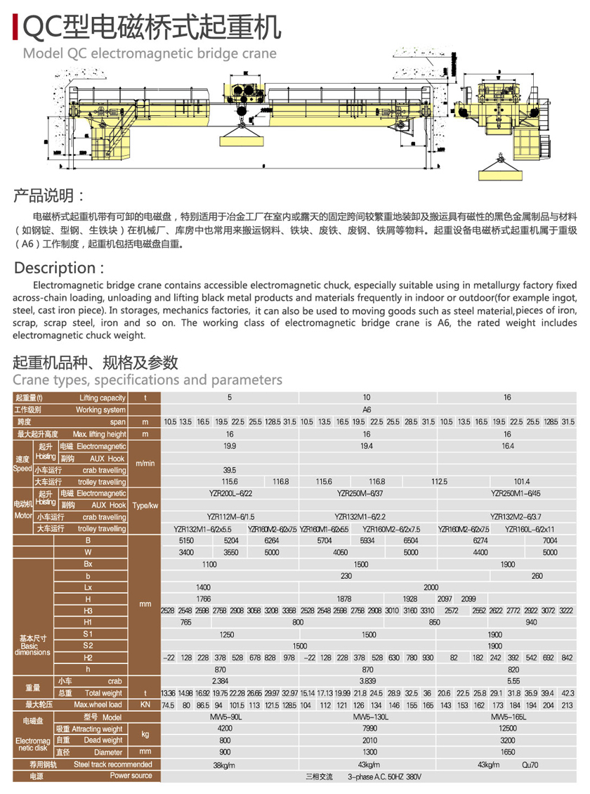 QC型電磁橋式起重機(jī)應(yīng)用范圍:本機(jī)適用于礦山、港口碼頭、鐵路貨站、露天倉(cāng)庫(kù)等物資裝卸和搬運(yùn),并可配備多種吊具進(jìn)行特殊作業(yè)。