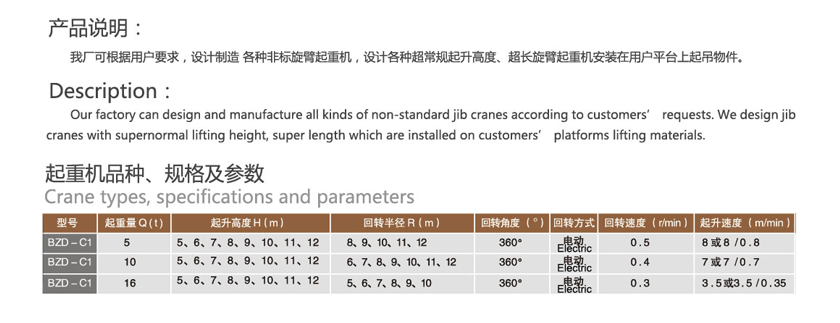我廠可根據(jù)用戶要求,設計制造各種非標旋臂起重機,設計各種超常規(guī)起升高度,超長旋臂起重機安裝在用戶平臺上起吊物件。