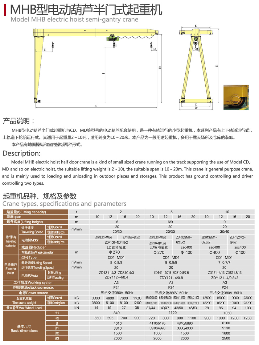 MHB型電動葫蘆半門式起重機(jī)為一般用途起重機(jī),多用于露天場所及倉庫的裝卸。本產(chǎn)品有地面操縱和室內(nèi)操縱兩種形式。