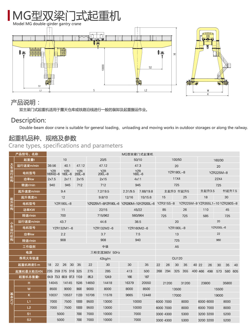雙主梁門式起重機適用于露天倉庫或鐵路沿線進行一般的裝卸及起重搬運作業(yè)。