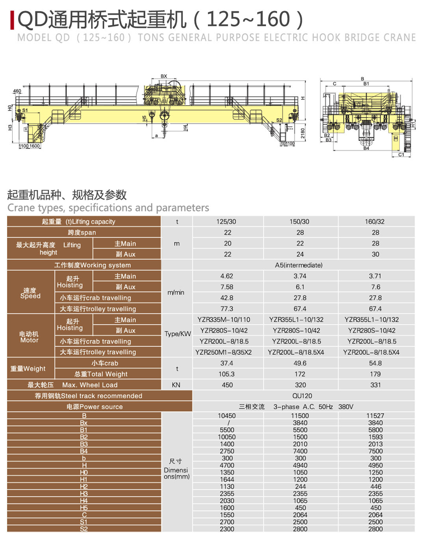 QD型通用橋式起重機(jī)-行車屬小車通用橋式起重機(jī),起重機(jī)依靠沿廠房行車梁上支承軌道方向的縱向移動、小車的橫向移動和吊鉤的升降來實(shí)現(xiàn)工作流程、常用起重量為5-50t,工作級別A5-A7級。操縱方式有地面控制、操縱室控制、遙控三種形式供用戶選擇。A5級適用于工作繁重程度不是很高的一般機(jī)械加工與裝配車間、金屬結(jié)構(gòu)車間、機(jī)械維修車間等;A6、A7級適用于工作較為頻繁或連續(xù)生產(chǎn)或連續(xù)搬運(yùn)的場合,還可以作為冶金和鑄造車間的鋪助吊運(yùn);其使用環(huán)境溫度在-20-40℃,相對濕度≤85%;另外A7級起重量小于50t的在滿足質(zhì)檢辦特【2007】375號文件關(guān)于新出廠安裝吊運(yùn)熔融金屬的起重機(jī)要求的情況下可用于冶金和鑄造車間吊運(yùn)熔融金屬,其使用環(huán)境溫度為-20~60℃。本起重機(jī)露天使用應(yīng)注明,以便配套防雨裝置