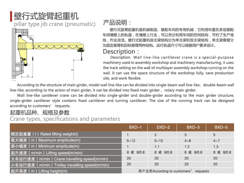 壁行式旋臂起重機(jī)是機(jī)械制造、裝配車間的專用機(jī)械,它利用布置在多層裝配車間墻壁上 的軌道,在墻壁上行走,可以充分利用車間的空間結(jié)構(gòu),節(jié)約了生產(chǎn)場地,作業(yè)靈活。 壁行式按主梁結(jié)構(gòu)分為單梁壁行式、雙梁壁行式,按主梁動作分為固定式主梁、旋轉(zhuǎn)式主梁。 壁行式起重機(jī)按主梁結(jié)構(gòu)分為單主梁和雙主梁結(jié)構(gòu),單主梁懸臂分為固定懸臂 和回轉(zhuǎn)懸臂兩種結(jié)構(gòu)。運(yùn)行軌道尺寸可以根據(jù)用戶要求設(shè)計(jì)。