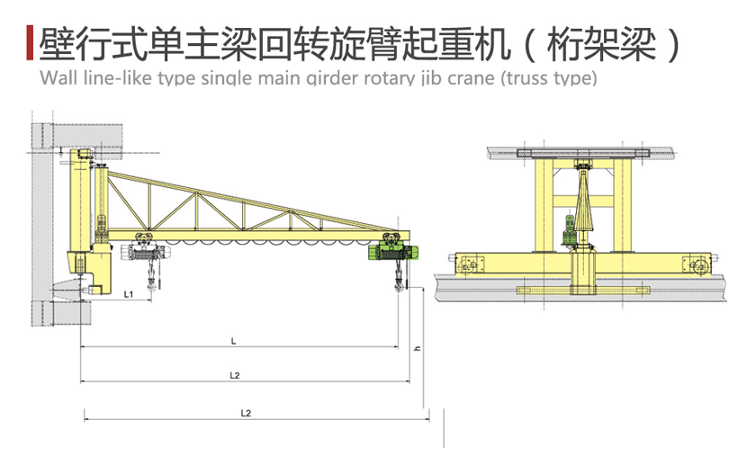 壁行式起重機按主梁結(jié)構(gòu)分為單主梁和雙主梁結(jié)構(gòu),單主梁懸臂分為固定懸臂 和回轉(zhuǎn)懸臂兩種結(jié)構(gòu)。運行軌道尺寸可以根據(jù)用戶要求設(shè)計。