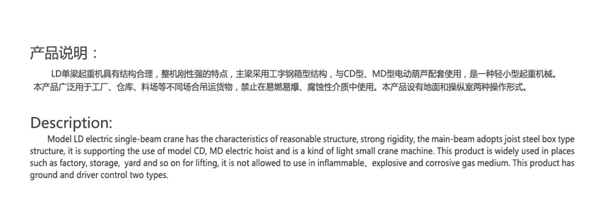 LD單梁起重機(jī)具有結(jié)構(gòu)合理,整機(jī)剛性強(qiáng)的特點,主梁采用工字鋼箱型結(jié)構(gòu),與CD型、MD型電動葫蘆配套使用,是一種輕小型起重機(jī)械。本產(chǎn)品廣泛用于工廠、倉庫、料場等不同場合吊運貨物,禁止在易燃易爆、腐蝕性介質(zhì)中使用。